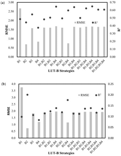 Next, the LAI-(Green, Nir) showed consistency with a lower RMSE of 1.16 and a higher R2 of 0.18. The LAI-Nir strategies showed inconsistency with a lower RMSE of 1.19 and lower R2 of 0.08. The rest of the LAI-LUT strategies appeared to be unacceptable with all of the RMSE higher than 1.50, especially for the strategies with the blue band, LAI-Blue (LAI-B1) performed the worst, with a RMSE of 3.7.