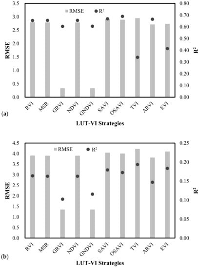 The performances of wheat LAI inversion with different LAI-VI strategies are compared in Figure 5. The LAI-LUT strategies with different VIs on 14 April (Figure 5a) demonstrated a consistency between the R2 and RMSE. Both of the LAI-GNDVI and LAI-GRVI strategies performed best to estimate LAI correctly from the GF-1 satellite data. With the exception of the above two LAI-VI strategies, the rest of the other LAI-VI strategies appeared to be unacceptable with the RMSE values all higher than 1.50, although the R2 values were relatively higher (R2 > 0.34). For the LAI-LUT strategies with price function established by VIs from the GF-1 data on 25 May (Figure 5b), both the LAI-GNDVI and LAI-GRVI strategies were also the best two strategies and showed inconsistency with the lowest RMSE values of 1.35 and 1.36, and the lower R2 of 0.12 and 0.10, respectively. The rest of the LAI-VI strategies appeared to be unacceptable with all of the R2 lower than 0.05 and RMSE higher than 3.50.