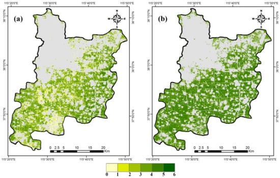 Figure 6 shows the LAI maps from the LAI-GNDVI and LAI-Green strategies derived for the elongation stage and the grain-filling stage. The results of winter wheat LAI inversion during the elongation stage showed that the values of LAI from 0 to 5 could be observed (Figure 6a). The high values appeared in the east of the study region, while the low values appeared in the middle. Due to the late sowing of some winter wheat varieties or drought, some values of wheat LAI had lower LAI values (<2.0) in the same period of elongation stage. The results of LAI inversion during the grain-filling stage demonstrated that LAI values from 0 to 6 could be observed (Figure 6b). For the same period, the LAI values were concentrated between 3.0 and 6.0, and the difference was relatively small between the numerical distributions. The two derived high-resolution LAI maps were in accordance with the actual situations, and good agreement between the estimated and measured LAI value could be observed with the RMSE of 0.34 on 14 April, and RMSE of 0.74 on 25 May.