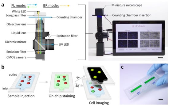 - Kim, B.; Lee, Y.J.; Park, J.G.; Yoo, D.; Hahn, Y.K.; Choi, S. A portable somatic cell counter based on a multi-functional counting chamber and a miniaturized fluorescence microscope. Talanta 2017, 170, 238–243. [Google Scholar] [CrossRef] [PubMed]