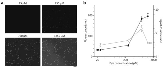 Effect of different dye concentrations on the fluorescence intensity of stained WBCs (signal) and background fluorescence (noise). (a) Fluorescence images of WBCs in the counting chamber at dye concentrations ranging from 25 to 1250 μM. Each micrograph was taken with the miniaturized microscope 10 min after introducing WBC samples. Scale bar, 50 μm. (b) The signal-to-noise ratio peaked at 750 μM, while the fluorescence intensity saturated at higher concentrations. Error bars: s.d. (n = 10).