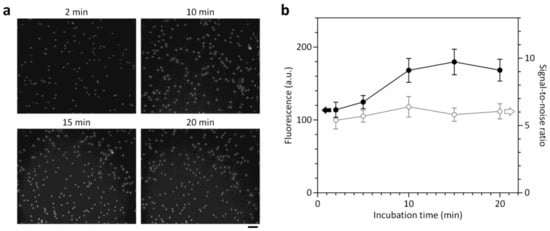Kinetics of on-chip fluorescence cell staining. (a) Fluorescence images showing the time evolution of WBC staining in the counting chamber at a dye concentration of 750 μM. Scale bar, 50 μm. (b) Over time, the signal-to-noise ratio did not change significantly, while the fluorescence intensity of WBCs reached a plateau at 10 min. Error bars: s.d. (n = 10).