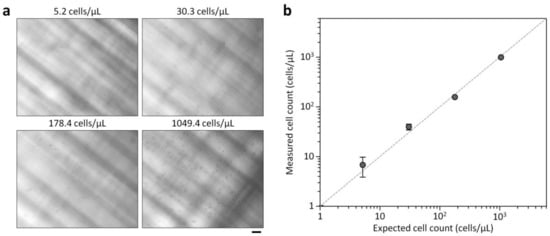 RBC counts measured with the cell counting platform and estimated with a standard hemocytometer. (a) Bright-field images of RBCs in the counting chamber at different cell concentrations. Scale bar, 50 μm. (b) On-chip RBC counts versus expected RBC counts from the hemocytometer, with the dotted line representing the unity slope. Error bars: s.d. (n = 3).