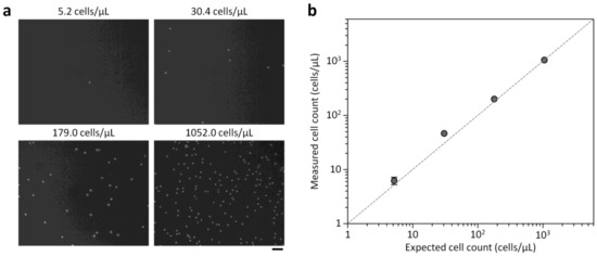 WBC counts measured with the cell counting platform and estimated with a standard hemocytometer. (a) Fluorescence images of stained WBCs in the counting chamber at different cell concentrations. Scale bar, 50 μm. (b) On-chip WBC counts versus expected WBC counts from the hemocytometer, with the dotted line representing the unity slope. Error bars: s.d. (n = 3).