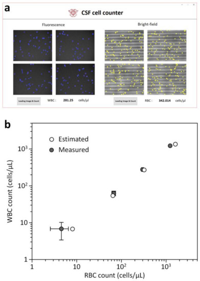 Counting blood cells in cerebrospinal fluid (CSF) is a clinical test to diagnose pathological conditions of the central nervous system (CNS) such as meningitis, multiple sclerosis, hemorrhages, and tumors [1,2,3,4,5]. CSF is a clear body fluid surrounding the brain and spine with a white blood cell (WBC) count of about 5 cells per microliter and no red blood cells (RBCs) under normal conditions. A significant increase in the WBC count can indicate infection or inflammation of the CNS or certain types of tumors (i.e., CNS and metastatic tumors). The presence of RBCs in CSF can be a sign of bleeding into CSF caused by aneurysm rupture, arteriovenous malformation, or head injury. Although collecting CSF samples is invasive, CSF cell counting is indispensable for diagnosing certain pathological conditions, especially in evaluating chronic meningitis [5].