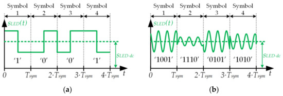 - In the case of PM, sLED−ac(t) is a pulse waveform that is added to the lighting level (i.e., sLED−dc). On-off keying (OOK) and pulse position modulation (PPM) are examples of PM schemes that are commonly used in VLC. Figure 1a shows an example of a PPM sequence that is made up of four symbols. Note that the position of the pulse at the beginning or at the end of the symbol period (TSym) determines the transmitted bit. Strategies based on PM are very simple to implement, but they are inefficient from the communication perspective because they have two problems. The first one is that for a given bandwidth they cannot achieve bit rates as high as the PBM schemes that are explained below. The second problem is that they are hardly jeopardized by the different trajectories that the visible light beams follow before reaching the receiver (i.e., multipath issues).