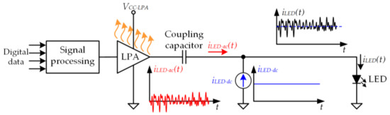 Figure 2 shows the conventional architecture of a VLC transmitter [3,5,14,15,16,17,18,19,20,21,22,23]. The LED driver is based on the use of a linear power amplifier (LPA) operating in class A, class B, or class AB that delivers iLED−ac(t). Moreover, a dc current source injects iLED−dc to adequately bias the LED. Since the LPA is only able to deliver a low power level, the architecture has a single LED and, consequently, the range of the VLC system is strongly reduced (units of centimeter). In addition, the power efficiency of an LPA ranges between 10% and 40% depending on the operating class and the modulation scheme that is being reproduced. Therefore, it consumes a lot of power and, as a result, the use of large and expensive cooling systems (i.e., heat sink, fan, etc.) to extract the heat from the semiconductor devices is mandatory. However, the LPA has two characteristics that explain why it is widely used for driving the LEDs for VLC: it achieves a very high bandwidth and it has a linear relationship between its input and its output. Both virtues ensure an accurate reproduction of the communication signal.