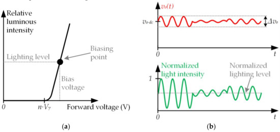 where Vγ is the knee voltage of each LED. Moreover, there is a linear relationship between light intensity and voltage when vo(t) > n·Vγ. This characteristic is very important because it implies that the information transmission can be performed by generating voltage variations proportional to the desired light intensity variations. Therefore, in the case of incorporating VLC into SSL, the voltage applied to a LED string must be made up of a dc component (vo−dc) that determines the lighting level and an ac component (vo−ac(t)) that is related to the communication signal: