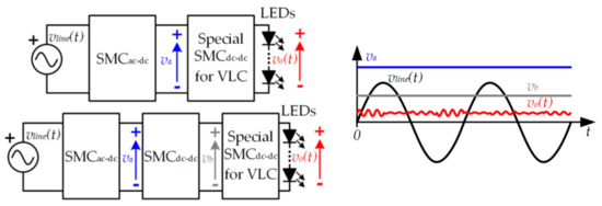 Although the SMCdc-dc is used mostly to provide a constant output voltage, it is also able to generate a variable output voltage (i.e., it is able to reproduce (5)). Therefore, a power-efficient SMCdc-dc can be used for completely driving the LED string (i.e., lighting and communication), thus avoiding the use of any inefficient LPA. However, this SMCdc-dc is very different from conventional SMCs used in lighting applications, such as the one depicted in Figure 3b, and, as will be detailed in the next section, the design becomes very challenging [26,27,28]. In any case, there are two main options for modifying the SSL architecture to incorporate VLC while keeping the use of SMCs. The first one consists in replacing the conventional SMCdc-dc used at the last stage of the SSL architecture by the SMCdc-dc specially designed for VLC. Therefore, this SMCdc-dc must provide the bias level (i.e., vo−dc) and the small voltage variations related to the communication signal (i.e., vo−ac(t)) from a much higher voltage (i.e., va). However, generating very small voltage variations from a much higher voltage is quite difficult using an SMCdc-dc. This problem can be alleviated by modifying the SSL architecture as follows. As in the existing SSL infrastructure, an SMCac-dc converts vline(t) into va. Then, a conventional SMCdc-dc (similar to the one depicted in Figure 3b) converts va into a lower constant voltage (vb) that is closer to the desired vo(t) and always higher than that one (i.e., always satisfying vb > vo(t)). Finally, an SMCdc-dc specially designed for VLC provides vo(t) from vb (see Figure 5).