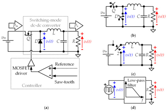 (a) Buck converter; (b) Equivalent circuit considering ideal complementary switches; (c) Equivalent circuit considering the two possible operating states; (d) The buck converter seen as a pulse-width modulator.