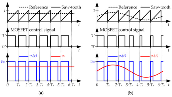 As previously indicated, the typical target of the buck converter is to provide a constant output voltage (see Figure 7a) by tracking a constant reference. In this case, the duty cycle (i.e., the width of the pulses) remains constant over time. However, there are special applications of power electronics where a buck converter is used to track a variable reference (see Figure 7b). In this case, the duty cycle changes over time according to the reference that is being tracked. Therefore, the buck converter operates as a power amplifier where the reference, vo(t), and vin are the input, the output, and the voltage gain, respectively.