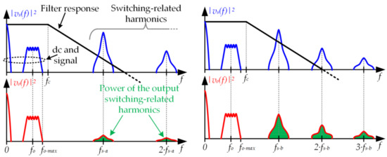 Figure 8 exemplifies the problem considering two switching frequency values (fs-a > fs-b) in order to highlight the impact of reducing fs. If fs is reduced (i.e., from fs-a to fs-b), switching losses fall and, as a result, the efficiency of the buck converter rises. However, since the switching-related harmonics are closer to the cut-off frequency of the filter (fc), they are rejected in a minor manner and, consequently, the distortion of the signal at the output will be higher. Note that in order to maximize the rejection of the switching harmonics, fc must be the lowest value that allows the pass of the communication signal without distorting it (regardless of the selected fs).