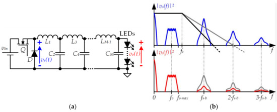 To reduce the gap between fo−max and fs without increasing the distortion caused by the switching-related harmonics, more sophisticated solutions than the conventional buck converter are mandatory. Several topologies derived from the buck converter that have been proposed for other applications of power electronics are reviewed in this section. The design modifications add certain features that make the topologies very interesting for the LED driver of VLC transmitters. In addition, these three strategies are combinable [30,31] and the optimum design depends on the particular VLC application, which determines the requirements of the VLC transmitter.