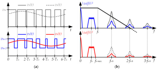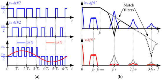 (a) Pulse-width modulator using a pulse voltage waveform that alternates between two positive voltage values (vin−1 and vin−2); (b) Reduction of the switching-related harmonics at the filter input and, as a consequence, at the filter output.