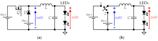 The buck converter is the fundamental SMCdc-dc and, as will be explained in the following sections, it is the cornerstone of the special SMCdc-dc designs for VLC that are proposed in this paper. The buck converter transforms the input voltage (vin) into a lower one (i.e., vo(t) < vin). Figure 6 shows the conventional buck converter topology and the equivalent circuits that will support the explanation of its operating principle.