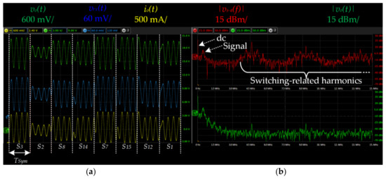 Figure 16b shows the spectrum of both vs−a(t) and vo(t). It is important to note that the dc component and the 16-QAM signal (around 500 kHz) pass through the filter without alteration, whereas the switching-related harmonics are attenuated due to the filter and the two-phase effect.