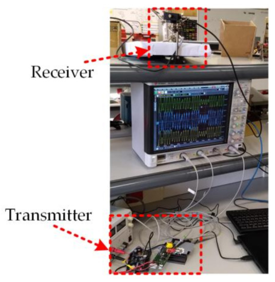 Finally, Figure 17 shows the VLC setup, which is made up of the aforementioned transmitter, the receiver, and the oscilloscope showing the most significant transmission waveforms. The distance between the transmitter and the receiver is around 1 m. To achieve the previous results, the electrical power delivered by the LED driver is close to 10 W, achieving power efficiencies between 85% and 90%.