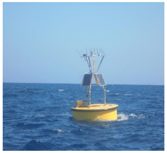 This buoy includes four solar panels (4 × 12 V/32Wp @ 92Wh/d) of 440 × 460 × 2 mm, two solar charge controllers and sealed lead-gel batteries 12 V/120 Ah—which supply and store the required energy—an AirLink Raven RV50 modem, and a system controller based on Raspberry Pi with a Sea-Bird UIMM for inductive communication with the seafloor OBS.