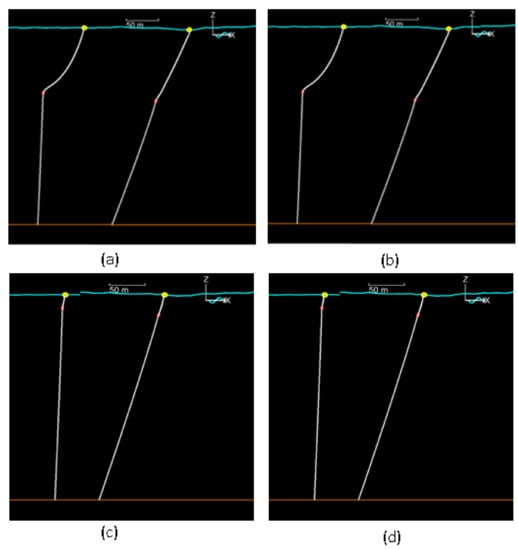 Orcaflex vertical view. Different configurations at a fixed time: Model 1: (a) ratio 1.2; (b) ratio 1.6. Model 2: (c) ratio 0.85; (d) ratio 1.2.