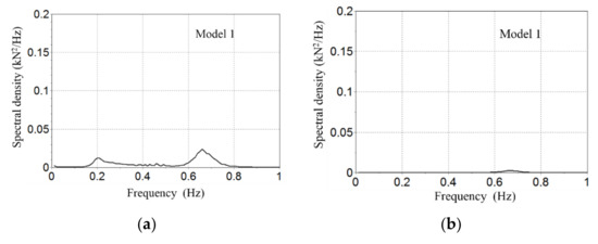 There is also a significance difference between maximum tensions at the seabed depending on the model, ranging from 25.9 kN in Model 1 to 7.5 kN in Model 2 (see Figure 8). Figure 9 and Figure 10 show the Fourier spectral density of tensions induced to the seabed using Model 1 and Model 2 respectively (notice the different scales in figures and between them). Dominant frequencies are always smaller than 1 Hz. The spectral analysis is basic in the study of dynamic behaviour. Spectral wave data mainly configures the spectrum, but wind, current, and the mechanical configuration modifies it accordingly, as can be seen in Figure 9. In contrast, with extreme conditions, the spectral density chart shows that main wave frequency is the dominant one (0.09 Hz) (see Figure 10), because the waves are the more impacting environmental condition.