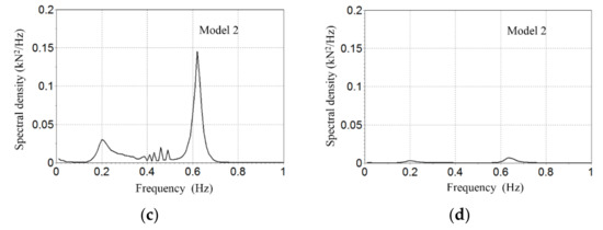 Fourier tension spectral analysis with extreme Mateo. Spectral density of the effective tension at the seabed (anchor) vs the frequency (Hs). (a) ratio 1.2 (b); ratio 1.4; (c) ratio 0.85 and (d) ratio 1.2.