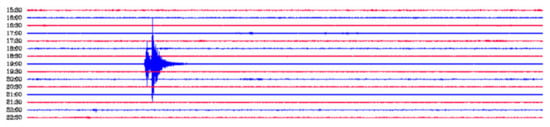 Caption from the Cabled Seismometer Station of OBSE of a seismic event located at Hautes-Pyrénées, of magnitude 3.7, that occurred on October 28 at 19.06 UTC [16]. A band filter between 4 and 10 Hz has been used to filter the raw seismic data.