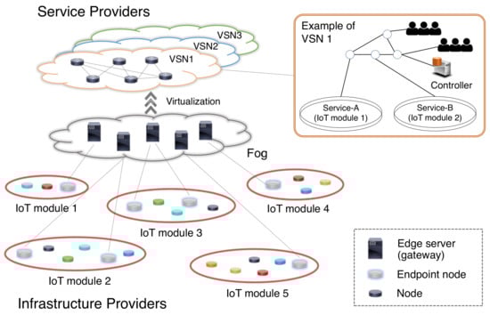 This virtualization architecture has several advantages for future IoT scenarios [18,19,20,22]. For instance, even if the type of services to be implemented on the VWSN is not envisaged beforehand, administrators can construct the service layer for any purpose while flexibly reusing physical resources at relatively low costs. Second, virtualization in WSN can address the heterogeneity in the infrastructure layer, wherein diverse types of physical network modules are individually deployed by the infrastructure providers. In addition, separating infrastructure and service layers results in simplified operation and accelerated development.