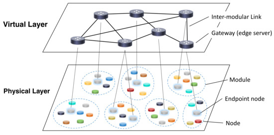 Virtualization in WSN is expected to play an important role on the IoT scenario [18,19,20,21,22], as explained in Section 2.1.2. It has enabled the construction of a VWSN topology over distributed wireless network resources with high flexibility and efficiency. In this study, we assume that a VWSN network is composed of two layers: physical layer and virtual layer (see Figure 2). On the physical layer, the physical network resources are deployed and connect to each other, and form heterogeneous network modules. Subsequently, the modules on the physical layer virtually connect to each other via wireless connections of inter-modular links between gateways (edge servers) and form the virtual layer. Regarding the assignment of endpoints of inter-modular links, all the nodes on the physical layer cannot behave as endpoints in a practical sense because the performance or role of the devices differ from each other. However, in this evaluation, we assume that all nodes have the ability to serve as an endpoint node. Therefore, our objective is to reveal the type of nodes that should be represented as an endpoint node from a topological viewpoint.