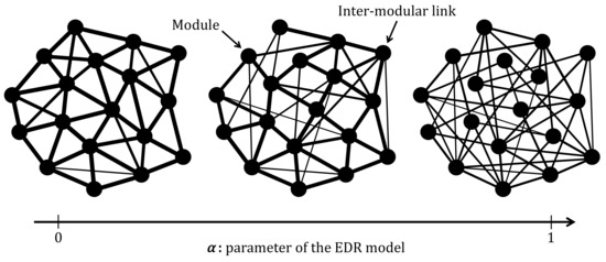 where denotes the relative distance between two modules. That is, , where the actual Euclidian distance d is divided by the largest distance of all the pairs of modules . Regarding the control parameter, is replaced in Equation (1) by a new parameter . The normalization constant c used in Equation (1) is eliminated because a predetermined number of inter-modular links are generated. Thus, can be regarded as a probability function that generates inter-modular links between any two given modules.