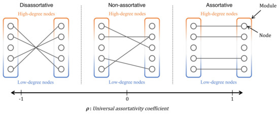 The typical patterns of inter-modular connectivity corresponding to different values of the universal assortativity coefficient are shown in Figure 4. When , the two nodes with similar node degrees are chosen as endpoints of links; thus, a pair of high-degree nodes or low-degree nodes is connected. It should be noted that, even if a pair of nodes has a similar node degree, the two nodes with the average node degree are not preferred because they do not wield significant influence, as indicated by Equation (5). On the other hand, when , a pair of two nodes with dissimilar degrees is assigned an inter-modular link. As approaches to zero, the endpoint nodes for inter-modular links are more randomly chosen.