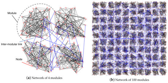 The ER model belongs to a class of random network models [57]. The degree distribution of the ER model follows a Gaussian distribution that is similar to the distribution observed in WSNs [58,59,60]. For the construction of networks based on the ER model, we randomly choose a pair of nodes and connect them until the total number of intra-modular links is .
