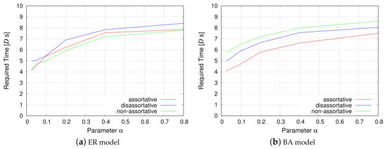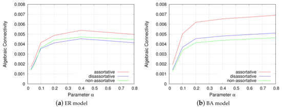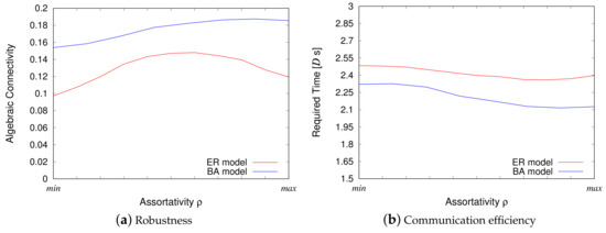 Figure 11 shows the algebraic connectivity for each network model. The order of the algebraic connectivity of the network models on the x-axis is similar for the ER and BA models. The and the SL model equally mark the lowest values for the algebraic connectivity. The SL model generates no long links, and the also does not generate long links due to the limitation imposed by Equation (6). The resultant grid-like topologies are easily broken into small clusters in the event of failures, as mentioned in Section 4.3. On the other hand, the , ER, and LL models equally exhibit the highest algebraic connectivity. This result is interesting because the LL model generates only long links and no short links, unlike the other two models. From this viewpoint, it can be said that long inter-modular links are more important for the creation of disjoint paths and to improve redundancy of a VWSN topology. The assortative topology has the highest robustness, as explained in Section 4.3.