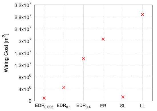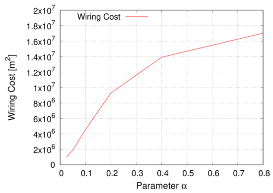 The result shows a monotonous change in the wiring cost when the parameter is varied. For small values of , the EDR model probabilistically tends to generate shorter links according to Equation (6). As the parameter increases, the restriction on generating long links is softened.
