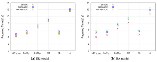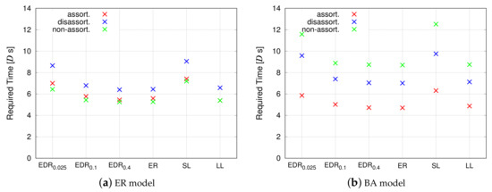 The performance for wiring cost shown in Figure 14 is similar to that of communication efficiency of the propagation delay in Figure 12. It can be said that the ratio of short inter-modular links is closely linked to both results. The and the SL model display the lowest cost, whereas the LL model exhibits an extremely high cost. The results simply reflect the procedure of generating inter-modular links: and the SL models generate short links, and the LL model generates long links. We can confirm that the cost of is also much smaller than the other models except for and SL models. This implies that, although the performance of the and ER models shown in Figure 11 and Figure 13 is similar, is still biased towards generating shorter links when compared with the ER model, which generates links of the average length. If is further increased, the inter-modular connectivity approaches that of the ER model.