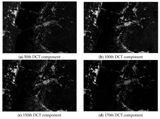 Figure 2 shows the plot of the first four transformed components of the new feature space after performing spectral-DCT on the Kennedy Space Center (KSC) dataset cube. Indeed, we can visually confirm the ability of DCT to concentrate most of the spectral energy in the first low-frequency coefficients. In contrast, Figure 3 presents the plot of four high-frequency components after performing DCT on the same dataset cube (component 50, component 100, component 150, and component 170). For these high-frequency components, the presence of heavy noise is visible, as there is no effective discrimination between the different classes.