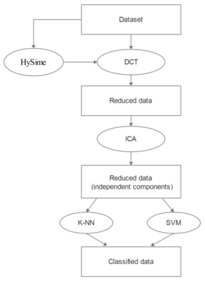 Therefore, our objective was to implement and test a new DCT-based preprocessing procedure for ICA that overcomes the limits of ICA regarding computational cost and make it more effective for dimensionality reduction in hyperspectral imagery analysis. To evaluate this procedure, SVM and K-NN classifiers were applied on the reduced data using ICA only, on ICA with PCA as preprocessing procedure and on ICA with our proposed DCT preprocessing procedure.