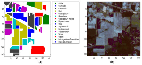 (a) Ground reference map of Indian Pines dataset. (b) False color composition of the Indian Pines dataset.
