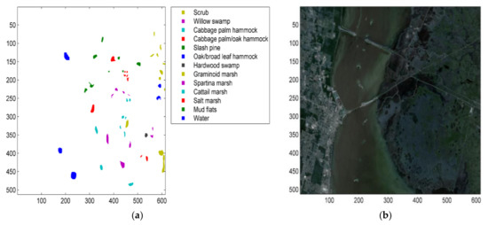 (a) Ground reference map of Kennedy Space Center dataset. (b) False color composition of Kennedy Space Center dataset.