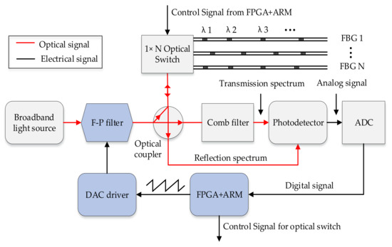 - Tsai, P.; Sun, F.; Xiao, G.; Zhang, Z.; Rahimi, S.; Ban, D. A New Fiber-Bragg-Grating Sensor Interrogation System Deploying Free-Spectral-Range-Matching Scheme with High Precision and Fast Detection Rate. IEEE Photonics Technol. Lett. 2008, 20, 300–302. [Google Scholar] [CrossRef]