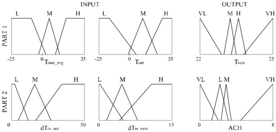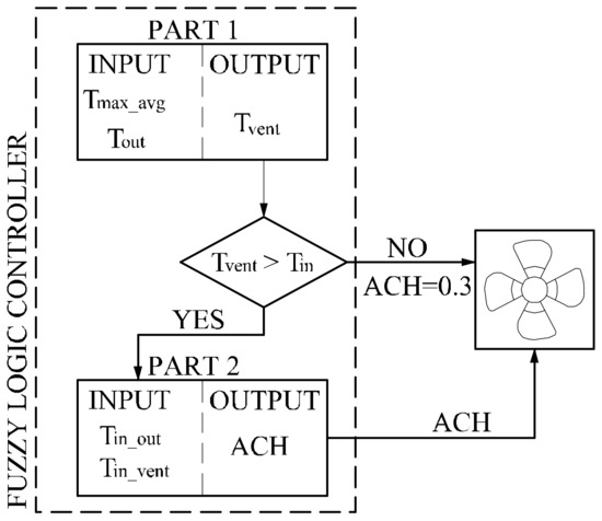 The above described conditions served as a basis for building a mechanical ventilation controller. Proportional-Integral-Derivative (PID) controllers are simple ones and are most widely used to control solutions for HVAC systems although it is often difficult to tune PID gains to their optimal values. In last few decades fuzzy logic has been widely used in literature to control HVAC systems [25]. The aim of fuzzy sets is mathematical representation of incomplete or imprecise information. Fuzzy logic controllers are more energy efficient, robust and have also a faster response to external disturbances because of their expert knowledge [26]. However, expert knowledge may not be enough to define all fuzzy logic controllers (membership function and rules). To solve this problem e.g., a self-learning fuzzy logic controller was developed in the work [27]. In our work a fuzzy logic controller is proposed to control ventilative cooling work. This controller was then optimized by genetic algorithms. A wide review of the literature related to the optimal HVAC system design can be found in the work by Ahmad et al. [26]. The new proposed fuzzy logic control (FLC) is divided into two parts (Figure 1). The outputs are the indoor air temperature (Tvent) at which additional ventilation is activated and additional air change rate (ACH).