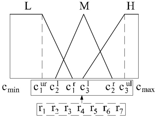 In our study the method presented in the article by Chiou and Lan [39] is used. In this encoding method both dependency problems are allowed. Unlike the original work, where encoding was used only for triangular MFs, the methods are expanded to trapezoidal MFs and real coding is applied. The encoding method assumes that the first and last degrees of fuzzy numbers are left- and right-skewed triangles for output values and trapezoids for input values of an FLC. The others are isosceles triangles as shown in Figure 2. The input variable with three linguistic degrees has six parameters to be calibrated and their orders are: