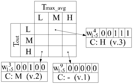 Fuzzy control rules are modified by adding a weight factor, , to the consequences of each rule, where j is the number of rule (in Figure 3 j = 1, …, 9), m is the number of linguistic variable for the output variable, (m = 1, …, 5 = : : ). This weight is used to determine whether the rule is included or not (Figure 3), e.g.: