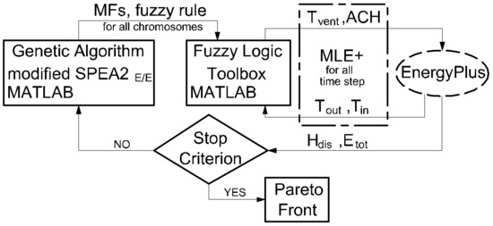 As shown in other studies, various methods are used to calculate the energy demand in buildings [47]. Programs such as ESP-r, TRNSYS, EnergyPlus, IDA-ICE are commonly used for building performance simulation (BPS). However, the use of BPS programs requires the building of detailed models [48,49,50]. As a results, not only do we receive global results, but also detailed ones for individual zones. Other methods are also used: statistical methods and methods based on artificial neural networks. These methods, which operate as black box models and base on the experimental data, have been strongly developed in recent years [51,52]. Simulations are then carried out much faster, but usually the whole building is treated as one zone and we only get global results. Often, they make it impossible to take the full dynamics of the building into account [53]. To estimate thermal comfort in this work, we need the results to be divided into individual rooms (a multizone model), taking into account the dynamics of internal and external thermal loads throughout the year. Therefore, the EnergyPlus [54] program was used for calculations. The MOEA optimization algorithm defined in the previous section is implemented in MATLAB (R2017a, The MathWorks Inc., Natick, MA, USA) and it is automatically coupling with energy simulation tool. The energy modelling tool EnergyPlus, which allows integrated calculations of the transfer of mass and energy inside the building, was used for the simulation and calculation of the objective function: Hdis, Etot. It is clear from the previous sections that input and output data of the FLC change dynamically during the simulation time. Therefore co-simulation between these programs has to be implemented. The co-simulation approach represents a particular case of simulation scenario where at least two simulator solve the coupled differential-algebraic systems of equations and exchange the data that couple these equations during the time of integration [55]. The MLE+ [56] MATLAB toolbox is used for co-simulation between MATLAB and EnergyPlus. Fuzzy Logic Toolbox is used for the execution of all interior operations in the FLC, for data (MFs parameters, rule base) which is received from the GA. To the authors’ knowledge this is the first time where optimization process of an FLC has been performed as an all-year co-simulation with the connection between the programs that was proposed here. The final goal of the optimization is the Pareto front, which represents the set of non-dominated solutions. The last step is to select a solution that represents the best FLC configuration. This process is called Multi-Critera Decision Making (MCDM).