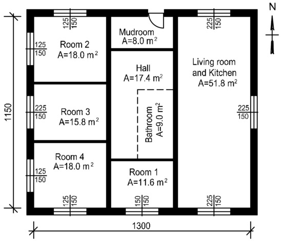 A single-family detached house without a cellar and with an unusable attic was chosen for the research. The total area of rooms is 150 m2 and the height of rooms is 2.6 m. The ground floor of the building is shown in Figure 5. The walls are of brick construction with polystyrene insulation (U = 0.22 W/m2K), the ceiling is a ferroconcrete structure with mineral wool insulation (U = 0.18 W/m2K) and the roof is covered with ceramic tiles and is uninsulated. The heat transfer coefficients (U) of the external partitions are according to the Polish requirements for thermal insulation for newly designed buildings [58]. The windows area amounts to 23.3 m2 (including glazing 15.7 m2). The solar heat gain coefficient of window glazing is 0.49, visible transmittance is 0.72 and heat transfer coefficient is 1.0 W/m2K.