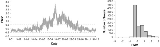 In Case 2 the operation of mechanical ventilation, which has an auxiliary role for the air conditioning system, was optimized. Such a system should be characterized by a lower energy demand and better thermal comfort. Mechanical cooling system works in the same way as in B2. The Pareto front is presented in Figure 14. The annual variation and frequency distribution of the PMV values in the living room for the FLC that was chosen basing on the TCC have been presented in Figure 15.