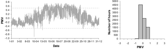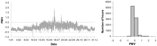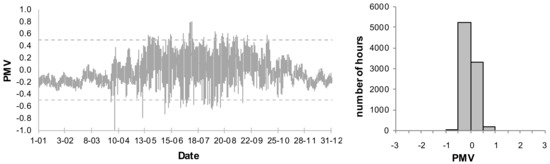 Thermal comfort means satisfaction with the thermal environment. The appropriate mathematical models make it possible to evaluate the thermal environment quality and determine the percentage of the dissatisfied with the thermal conditions [40,41,42]. In this study the indicator used to assess thermal comfort is the Predicted Mean Vote (PMV), based on Fanger’s model [43]. Basing on the temperature measurements in a room, the average radiation temperature as well as the airflow rate, the PMV allows to predict the mean thermal sensation of a group of people whose activity is known and whose clothes have the known thermal insulation. The PMV index predicts the average mean score for a large group with the seven-point thermal sensation scale (from −3 (too cold) to +3 (too warm)). Among a population the lowest Percent of People Dissatisfied (PPD) with the thermal environment is when the PMV equals zero. In our study the absolute PMV value of 0.5 is assumed as the limit of the comfort zone, similarly to other works [44]. It is the medium exigent comfort category in PN-EN ISO 7730:2006 [40] (category B from range A–C) and PN-EN 15251:2012 [41] (category II from range I–IV) standards.