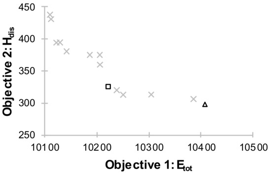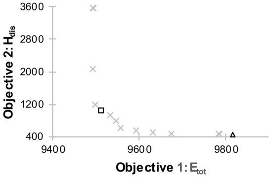 Therefore, in order to optimize the FLC, two parameters were considered: Etot—energy demand of the building and Hdis—number of hours with |PMV| > 0.5, representing the cumulative time with discomfort over the period of optimization.