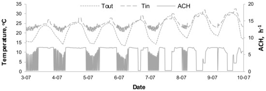 Figure 11 presents the temperature variation (outdoor and indoor) in the living room as well as air change rate in the hottest week of the year using TCC controller. The rapid increases in temperature in the Figure overlap with the operations of an oven in the kitchen. When the outdoor temperature exceeds the indoor one, the ACH is at the minimum value of 0.3 h−1. Since both heating and cooling have been designed as perfectly tracked, the ACH changes in case 1 were not limited in any way in consecutive time steps. Hence the dramatic ACH changes in the graph, which influence indoor temperature, fluctuations, even during the night hours. This is due to the initial assumptions of the ideal controller for HVAC systems.