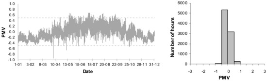 The presented analyses do not include the PMV < −0.5, when the night temperature decreases. An annual variation of the PMV for the living room and frequency distribution of the PMV values for the basic systems B1 and B2 are presented in Figure 6 and Figure 7. As the living room is connected to the kitchen, the thermal conditions are subject to greatest fluctuations. Thus the thermal conditions in that room are expected to be the worst.