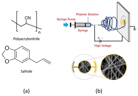 Polyacrylonitrile solution was prepared by dissolving 0.60 g PAN in the 10 mL DMF, followed by stirring at 1000 rpm for 24 h. A small amount (1%) of non-ionic surfactant, Triton X-100, was added to the PAN solution to lower its surface tension. Mechanical stirring at 900 rpm was extended for 30 min to obtain a homogeneous solution in the presence of a surfactant. The schematic of the electrospinning set-up and chemical structure of PAN and safrole are shown in Figure 1.